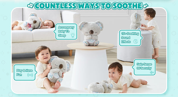 Meet the Breathing & Glowing Koala, the ultimate sleep companion for babies! Designed with scientific sleep-soothing technology, it features a gentle breathing night light, 10 calming lullabies, white noise, and an adorable sucking motion to comfort and entertain. No more endless rocking or nursing to sleep—this plush toy helps babies fall asleep faster and easier while fostering healthy sleep habits. Made from ultra-soft, baby-safe fabric, it’s washable, durable, and perfect for cuddles. Say goodbye to sleepless nights and hello to peaceful rest for both baby and parents!